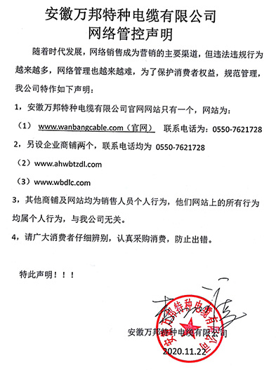 鄭重聲明:安徽萬邦特種電纜有限公司官方網站為:www_wanbangcable_com.862225.com,除此之外無任何子網站或合作網站,其余均為假冒偽劣。電話:0550-7621728 13485756353 地 址:安徽省天長市滁州高新技術產業開發區經四路29號